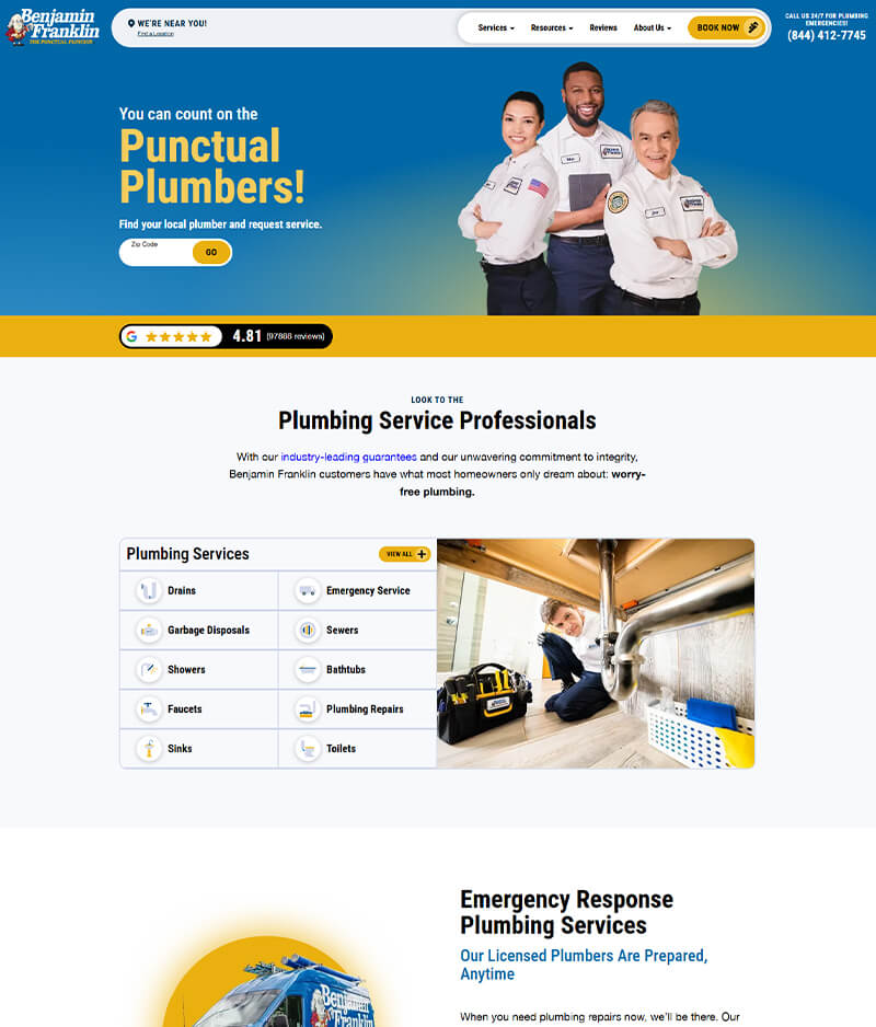 Benjamin Franklin Plumbing, known nationwide as “The Punctual Plumber®”, is a trusted home services franchise with over 260 locations across the U.S. Founded in 2001 and now part of Authority Brands, the company is recognized for its $5-per-minute on-time guarantee and 24/7 emergency service. Its strong offline reputation as a reliable, customer-first brand needed a digital presence to match.