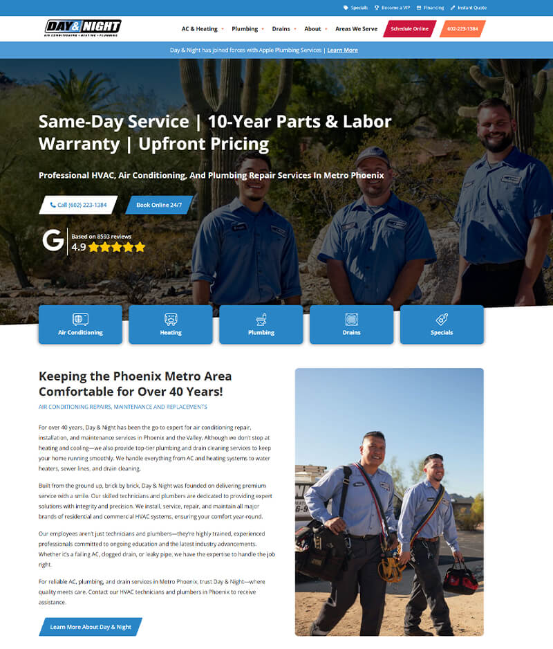 Founded in 1978, Day & Night Air Conditioning is a family-owned HVAC and plumbing company based in Phoenix, Arizona. Known for “old-fashioned quality with modern reliability,” the company built its reputation on craftsmanship, integrity, and customer satisfaction. Its team of highly trained technicians and plumbers provides everything from maintenance and repairs to complete system replacements always focused on long-term relationships and trusted service.