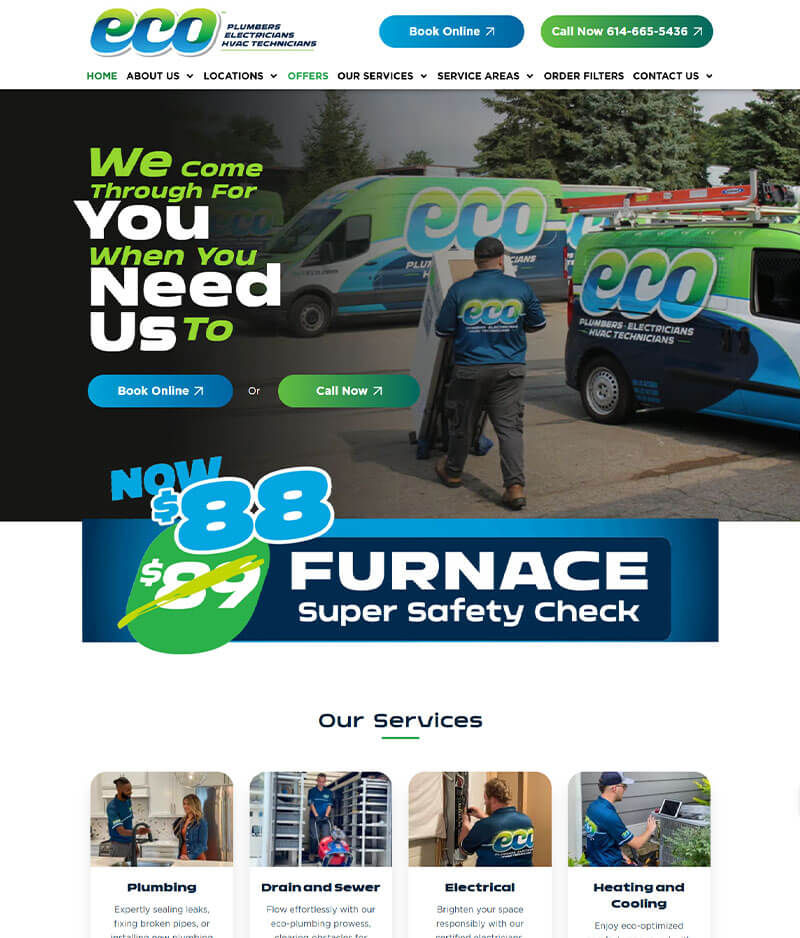 - Service pages by intent (Plumbing, HVAC, Electrical) with price anchors, financing, badges, and neighborhood proof.